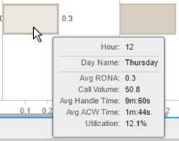 The Avg RONA metric for a specific hour of all occurrences of a weekday in the selected Week range is displayed in the form of a horizontal bar graph and color-coded based on the average number of RONA calls.