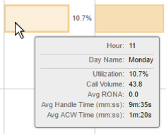 Percentage of utilization is the total time spent by an agent handling calls including talk time, hold time, AUX and after call work time. This metric helps you understand the amount of staffing time spent on call-related work.